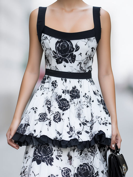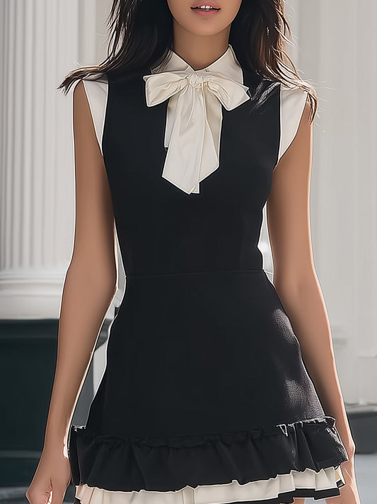 Maeyira Black and White Mini Dress with Bow Collar - Sleeveless Ruffle Hem
