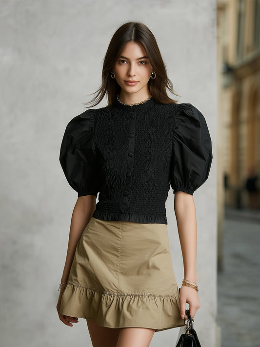 Maeyira Black Bodycon Mini Dress with Mesh Puff Sleeves