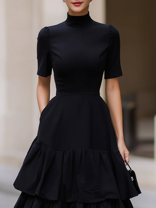 Black High Neck Short Sleeve Tiered Maxi Dress With Pockets