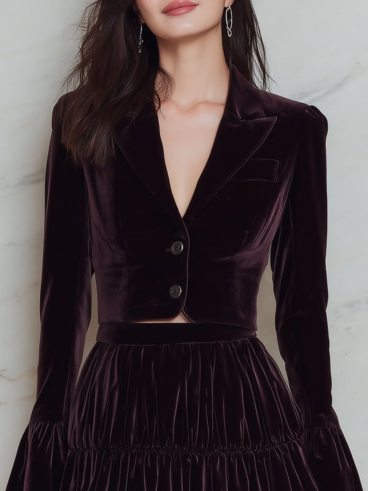 Maeyira Burgundy Velvet Crop Blazer Tiered Pleated Mini Skirt Set